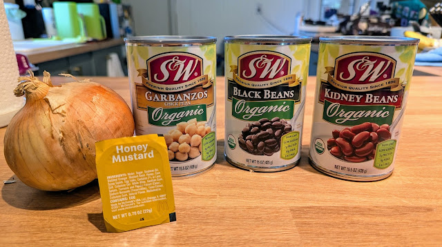 A can each of S&W Garbanzo Beans, Kidney Beans, and Black Beans, a yellow onion, and a packet of McDonald's Honey Mustard